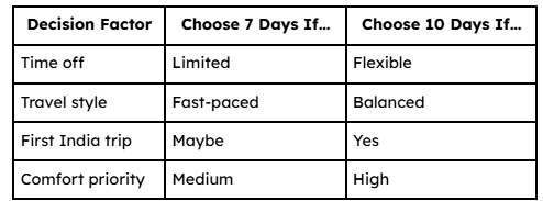 Quick Overview — 7-Day vs 10-Day Golden Triangle Tour