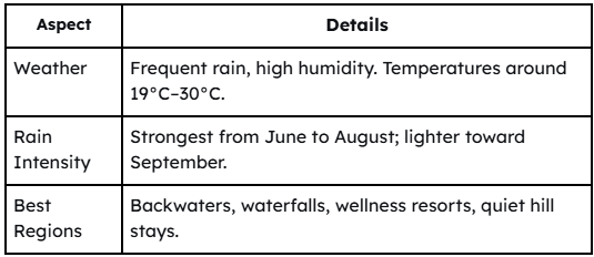- Striking scenery: Waterfalls like Athirapally Waterfalls are at full force, and the countryside turns intensely green